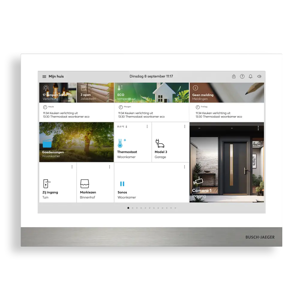 De bediening verloopt centraal via het Busch-SmartTouch® 10"-paneel, via de app of met een spraakassistent.