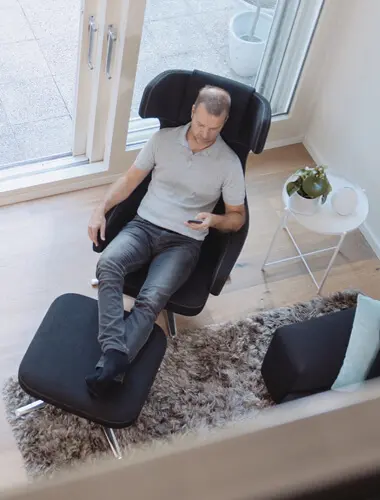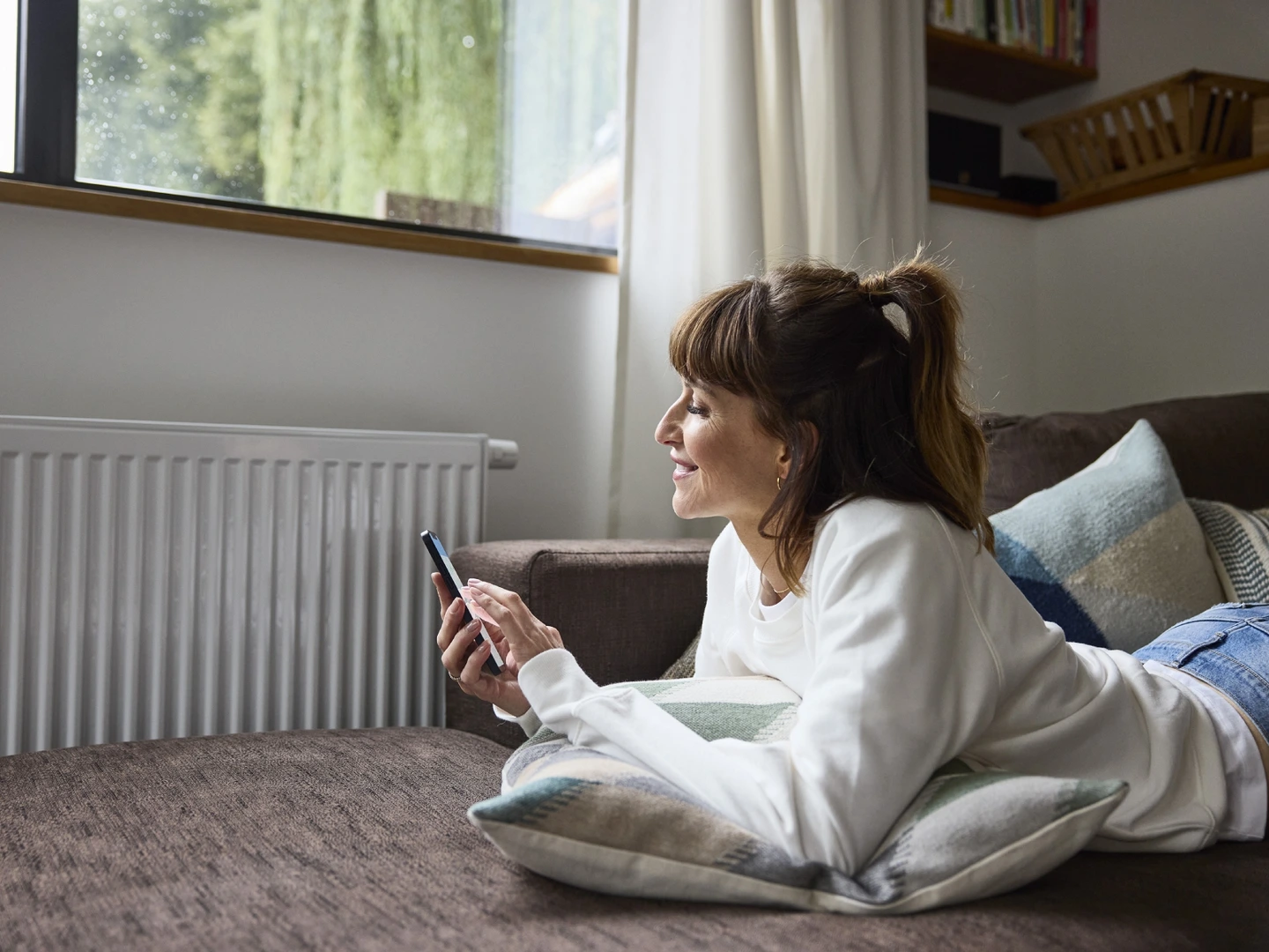 Ein Mann sitzt entspannt auf einem Sofa und benutzt ein Smartphone, um ein Video anzusehen.