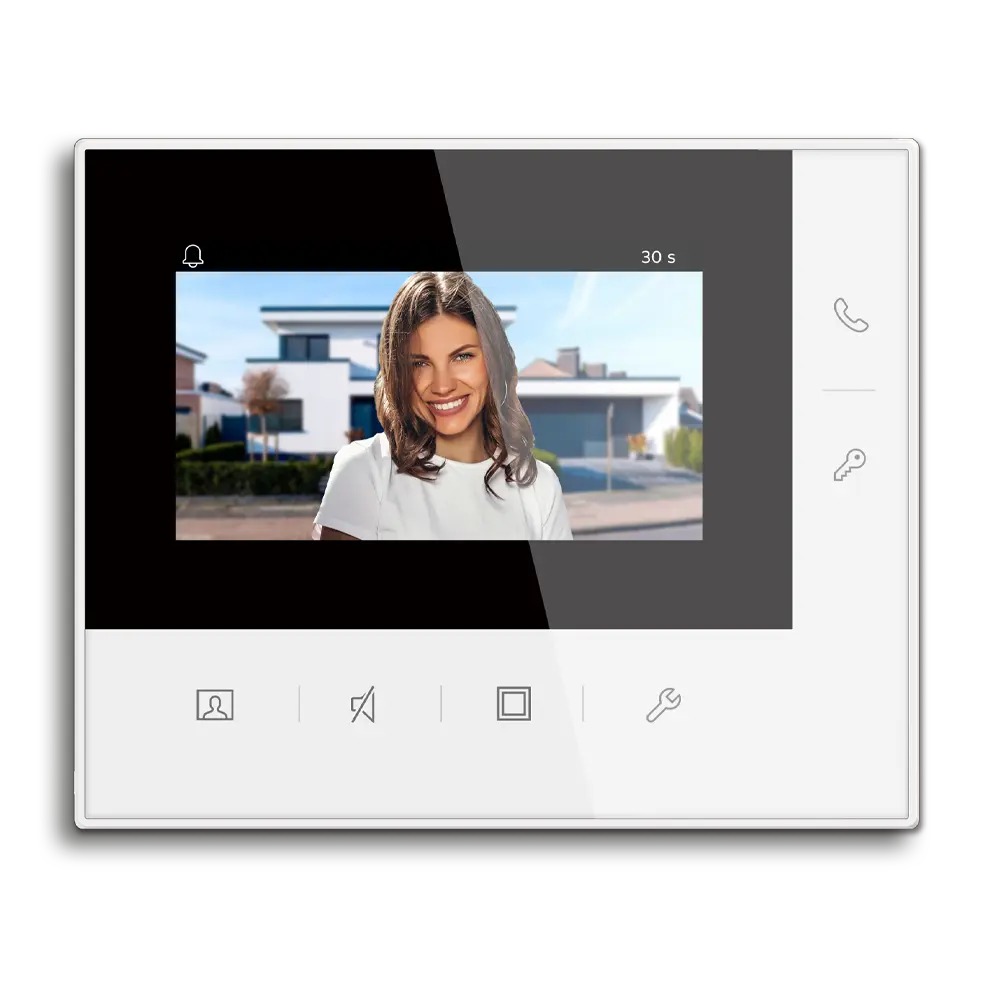 Het binnenstation past dankzij de afmetingen van 152 mm × 124 mm × 22,5 mm harmonieus in elk interieur en is geschikt voor opbouwmontage. Het heldere 4,3"-display zorgt voor een scherp en betrouwbaar videobeeld.