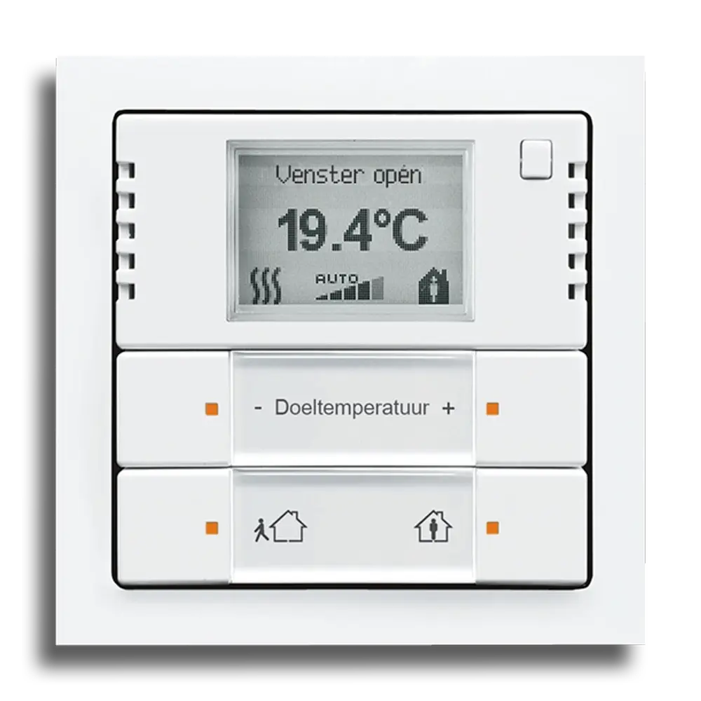 De ruimtetemperatuurregelaar is uitgerust met tastensoren en een touchdisplay. Het display toont de huidige temperatuur en de actieve functie (verwarmen/koelen). In combinatie met een raamdetector detecteert de ruimtetemperatuurregelaar of ramen in de ruimte geopend zijn en schakelt dienovereenkomstig de verwarming in of uit.