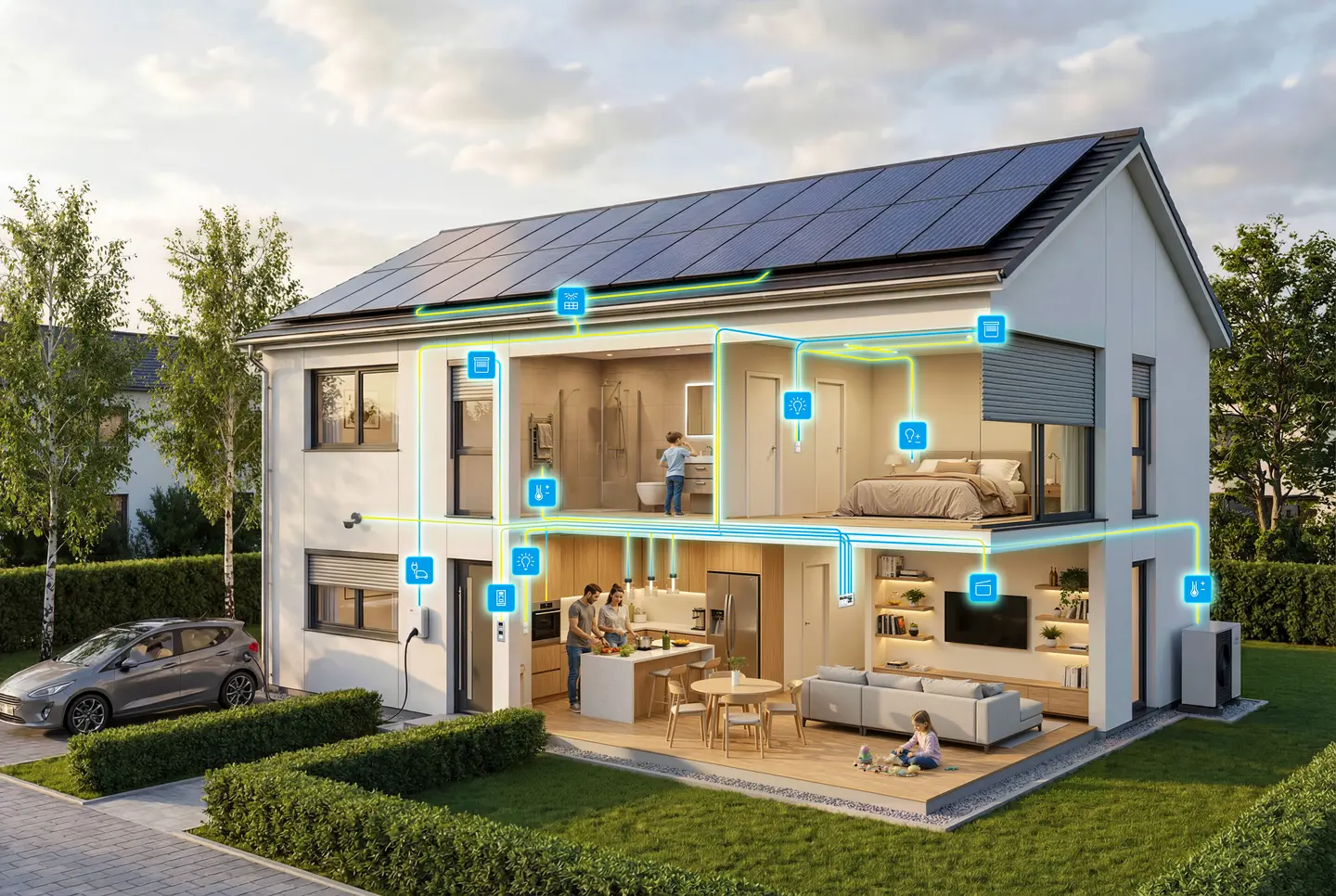 Via een netwerk gekoppelde en compatibele huishoudelijke apparaten zoals wasmachines, koffiezetapparaten of ovens kunnen in het Smart Home-systeem worden geïntegreerd.